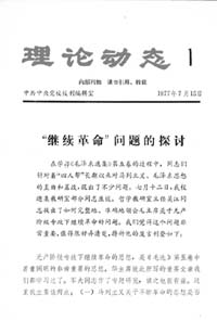 《“繼續(xù)革命”問題的探討》一文,近4500字。文章講了兩個問題:(一)馬列主義關(guān)于不斷革命的思想是否僅限于由民主革命不間斷地轉(zhuǎn)變?yōu)樯鐣髁x革命的思想,而沒有包括社會主義條件下的不斷革命思想?(二)無產(chǎn)階級專政下繼續(xù)革命的對象、任務(wù)是什么。文章重點(diǎn)是講后面一點(diǎn)。