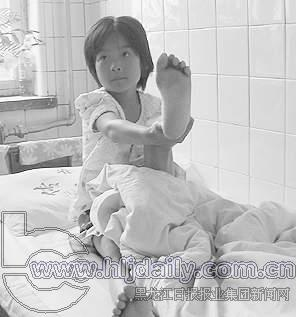 馮佳緣今年11歲,在齊齊哈爾市和平二小讀書,開學(xué)念四年級,是這次芥子毒劑桶泄露中毒事件中第35個入203醫(yī)院治療的患者。也是目前事故的第11現(xiàn)場———齊齊哈爾市第五中學(xué)現(xiàn)場惟一一個中毒者。記者在病房見到她的時候,醫(yī)生正在給她換藥、清創(chuàng)。醫(yī)生一再安慰她別怕疼。但在藥快換完的時候,馮佳緣還是沒能忍住、哭出了聲兒。換完藥后,馮佳緣告訴記者,4日晚上,她只是在5中的操場上路過,結(jié)果第二天腳起泡了,然后去住院,直到前天她看到報(bào)紙后,才轉(zhuǎn)到203醫(yī)院救治,現(xiàn)在馮佳緣的病情已稍有好轉(zhuǎn)。