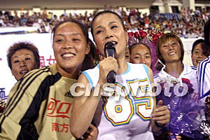 八月十七日晚,歌手田震(前右)和女足隊員在2003年“可口可樂”杯中國女足南北明星爭霸賽開幕式上,共同演唱中國女足隊歌《風雨彩虹鏗鏘玫瑰》。經過半個月的集訓后,中國女足隊員在北京舉行的爭霸賽上亮相。中新社記者:盛佳鵬