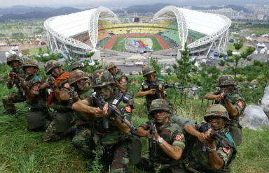 2003年世界大學生運動會將于8月21日至31日在韓國大邱舉行。為了保證即將在開幕的第22屆世界大學生運動會的安全,韓國將動用7,400名警察日夜守衛在各地賽場周圍,以保證本屆運動會在安全方面萬無一失。圖為8月19日韓國士兵在大邱主會場附近巡邏。