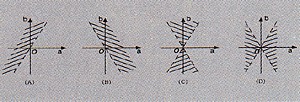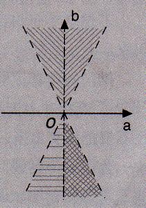 在圖A、B和D中,凡邊界均以虛線示之,凡不連通的區域均以不同斜率的陰影線區別之。然而,在標準答案圖C中的b軸用實線表示,并且b軸兩側與b軸相鄰的角形區域用同一斜率的連貫陰影線表示為單一的連通區域,所以b軸明確地不是邊界。這樣就使“不包括邊界”這個附注不能對b軸發生作用。圖C中只有兩根邊界(虛線表示),所以圖像M表示了不等式F(|b|>|2a|),而不表示不等式E(|b|>|2a|,且a≠0)。所以標準答案圖C是錯誤的。四個選項中沒有一個正確,這與提示中所說“在每小題給出的四個選項中,只有一項是符合題目要求的”相矛盾,從而該題是錯題!而正確答案應為圖二。