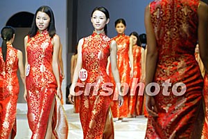 身著喜慶大紅旗袍的四十余名模特佳麗,二十三日在江西省會南昌市的T型臺上進行緊張排練,她們將參加當日舉行的新絲路模特大賽南昌賽區總決賽。中新社記者:毛建軍