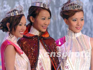 2003年度港姐競選決賽,二十三日晚在紅(石+勘)香港體育館舉行, 曹敏莉獲冠軍(中)、楊洛婷獲亞軍(左)、戚黛黛獲季軍。 中新社記者:錢興強(qiáng)