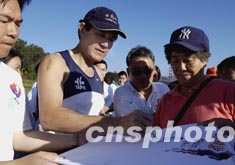 美西時間二十四日清晨,正在美國訪問的臺北市長馬英九沿舊金山灣海岸參加“跑出健康”晨練活動并為參加清晨慢跑的晨練者簽字留念。作者:陳鋼