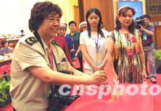 中國婦聯黨組書記、副主席黃晴宜(左一),中國婦女九大主席團常務主席彭珮云(左二)在二十五日的中國婦女第九次代表大會第二次全體會議上和中國科技部副部長鄧楠(右一)相談甚歡。中新社記者:廖文靜
