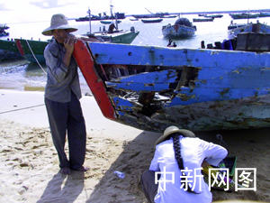 中新社海口八月二十六日電(記者關向東王辛莉通訊員余茂生)海口新海村漁民陳家位,一臉疲憊地依在剛打撈出水的自家漁船船頭,船頭左側一大洞,后艙甲板翻倒在沙灘上,兩年前花七萬元人民幣造的漁船因一場臺風轉眼間散架成一堆廢木。
