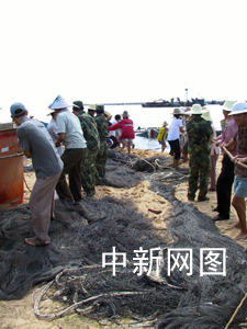 記者在現場看到:海南省海事局派出打撈船在緊張作業,來自駐地的海軍潛水員忙著幫漁民將纜繩系上水底的漁船,而秀英區武裝部的戰士與當地的干部、村民一道拉纜,將剛剛出水的船只拖上岸。