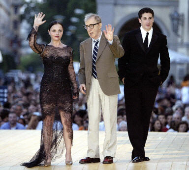 美國著名導演伍迪-艾倫的新作《除此之外》作為開幕片首先在威尼斯電影節亮相。圖為《除此之外》的導演伍迪-艾倫(中),女主角Christina Ricci(左)以及男主角Jason Biggs(右)亮相開幕式。