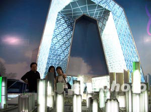 中央電視臺建臺四十五周年發展成就展八月二十九日在北京軍事博物館開幕,展出的中央電視臺新臺址模型吸引了眾人的目光。中新社記者:杜洋