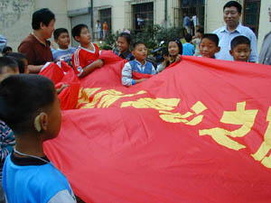 滄州聾啞學(xué)校的孩子們觸摸愛心——“愛心之旅”采訪團(tuán)受到聾啞兒童的歡迎。華夏時(shí)報(bào)圖