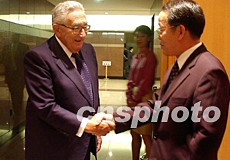 美國前國務卿基辛格(左)八日來到紐約的中國常駐聯合國代表團駐地,參加王光亞(右)舉行的就職招待會,并向王光亞出任中國常駐聯合國代表表示祝賀。作者:龔文謨
