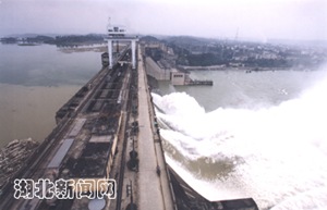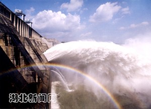 中新湖北網(wǎng)9月9日電 漢江第二次洪峰于八日凌晨一點(diǎn)到達(dá)丹江口水庫(kù),最大洪峰流量達(dá)二萬(wàn)八千五百立方米每秒,大約在今天下午五點(diǎn)丹江口水庫(kù)水位將達(dá)到一百五十六點(diǎn)七米,為一九八四年來(lái)最高水位。為緩解對(duì)水庫(kù)壓力,丹江口水庫(kù)開(kāi)閘向下游泄洪。劉鐵軍 攝