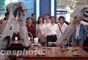 為期四天的第六屆中國北京國際科技產業(yè)博覽會十二日在北京拉開序幕,首鋼集團展出的機器人象棋表演賽吸引觀眾。中新社記者:張宇