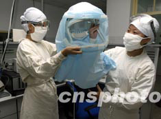 根據北京市新出臺的防治SARS緊急預案,如果出現一例SARS患者或疑似患者將首先啟動北京市地壇醫院。9月15日,地壇醫院ICU的護士已經將治療SARS患者的防護、治療設施準備到位以備隨時啟用。中新社記者:任晨鳴