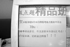 據《京華時報》報道,北京某高校剛剛參加完英語四級考試的小鮑反映,前天,不少同學在地質大學看到當晚在該校將舉行“四級考試考前點題培訓”的海報,入場券50元,舉辦方為北京宇航考試培訓學校。“這次培訓點中了試題中大概50分的內容!”