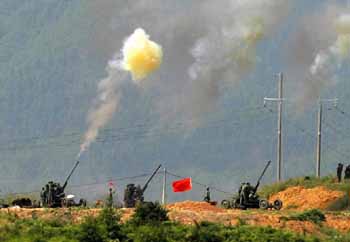 突然,煙霧彈、錫箔干擾彈等在上空散開(kāi),此時(shí),民兵預(yù)備役官兵們?cè)缫逊植荚诓煌恢茫瑢?shí)施對(duì)空射擊。隨著震耳欲聾的“轟隆”聲,一團(tuán)團(tuán)煙霧驟然從地面騰空而起,糧庫(kù)、公路、油庫(kù)及居民房成了一片火海,整個(gè)演練場(chǎng)上硝煙彌漫。