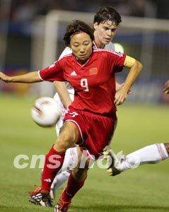 過(guò)早的失球并沒(méi)有讓中國(guó)隊(duì)自亂陣腳,中國(guó)隊(duì)依靠整體配合向?qū)Ψ疥嚨匕l(fā)起猛攻,創(chuàng)造了多次得分機(jī)會(huì)。第八分鐘,中國(guó)隊(duì)在對(duì)方禁區(qū)右前方獲得一次任意球機(jī)會(huì),孫雯主罰,以一記漂亮的“香蕉球”越過(guò)人墻,球打在橫梁上彈出;十二分鐘,白潔在對(duì)方小禁區(qū)前沿頭球攻門偏出;十六分鐘,孫雯在對(duì)方禁區(qū)內(nèi)得球,連續(xù)晃動(dòng)后一腳打門,球貼著球門立柱出了底線;三十六分鐘,孫雯在非常困難的情況下將球傳給插入禁區(qū)的畢妍,后者倉(cāng)促起腳,錯(cuò)失了一次破門的絕佳機(jī)會(huì)。
