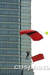 下午三時許,開幕禮炮聲后一位身著紅色跳傘服的運動員隨即應聲而下,他的縱身一躍亦解開了“中華高樓跳傘第一人”的謎團,此人便是挪威跳傘家特杰·海爾維森。他背對著藍天,在躍出平臺后不久就打開了紅色降落傘,并隨之展開了一面中國國旗。據悉,此次是海爾維森先生第三次中國之行,為了這一次機會他足足等待了四年。在準確降落在著陸點后,海爾維森先生顯得特別激動,他興奮地說:“帶著中國國旗翱翔藍天是我一生中最為難忘、最為激動的一刻。”