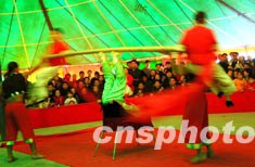 “十一”長(zhǎng)假期間,許多游客來(lái)到雜技之鄉(xiāng)河北吳橋一睹雜技風(fēng)采。這里除了傳統(tǒng)的吳橋雜技外,還增加許多新組合的節(jié)目。圖中利用云貴民族舞蹈中的細(xì)節(jié)與雜技蹬凳結(jié)合編排的表演,使觀眾在輕松娛樂(lè)中體會(huì)雜技高超的技藝。中新社記者:王麗南