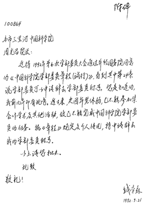 錢學森1955年回國,1957年被增選為中國科學院學部委員(1994年改稱中國科學院院士)。錢老當然十分珍視中國科學界給他的這一榮譽,并積極參加中國科學院學部委員的各種學術活動。但到晚年,當他行走困難,不便參加學術活動以后,便給當時的中國科學院院長周光召寫信,主動申請辭去學部委員的稱號(錢老給周光召的信附后)。