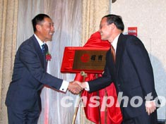圖為揭牌儀式上,中國(guó)駐紐約總領(lǐng)事劉碧偉(右)向招商銀行董事長(zhǎng)秦曉(左)表示祝賀。