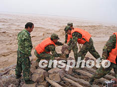 十月十二日,濟南軍區(qū)官兵在河南蘭考的黃河灘三十五號壩砌石固堤岸。黃河下游蘭考三十五號壩是蘭考灘區(qū)的重點,一旦被沖垮,黃河被撕開的“口子”就會越來越大,危及蘭考灘區(qū)和下游的山東,后果不堪設(shè)想。目前各種搶險物資已基本運送到位,但由于降雨,水位有上漲趨勢,給防洪搶險工作帶來一定的難度。作者:慎重