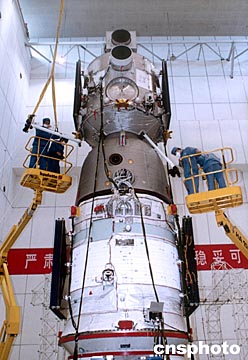 神舟五號(hào)載人飛船十月十五日上午九時(shí)在酒泉衛(wèi)星發(fā)射中心載人航天發(fā)射場(chǎng)發(fā)射升空。圖為神舟五號(hào)載人飛船組裝調(diào)試階段的資料圖。中新社圖