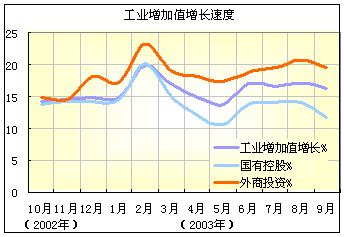 中國9月份工業生產主要情況及特點包括:國有、股份制、“三資”企業生產增速有所回落,集體企業生產增長加快。9月份,國有及國有控股企業完成增加值1672億元,比上年同月增長11.6%,減慢2.4個百分點;股份制企業增加值1506億元,增長16.5%,增速比上月減慢1.4個百分點;“三資”企業增加值1026億元,增長19.4%,減慢1.3個百分點。集體企業和股份合作企業生產增長則分別比上月加快1和5.1個百分點。