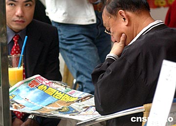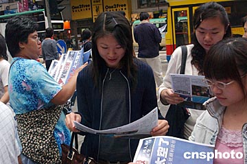 香港市民爭看號外。“神舟”五號飛船十月十五日順利升空,香港傳媒特發號外,圖為香港市民在街頭爭看號外。中新社記者:錢興強