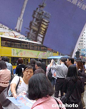 中國“神舟”五號十月十五日上午九時在酒泉衛星發射中心成功升空,香港市民關注“神舟”五號首次載人發射成功。中新社記者:錢興強