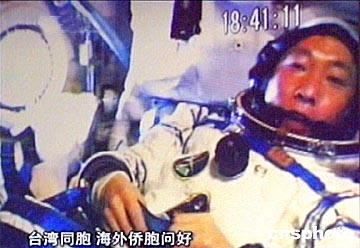 10月15日,隨“神舟”五號載人飛船在太空遨游的中國航天員楊利偉,在飛船上向臺灣同胞、海外僑胞問好。中新社圖