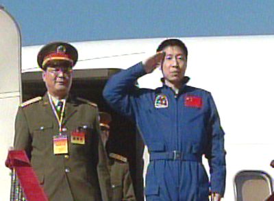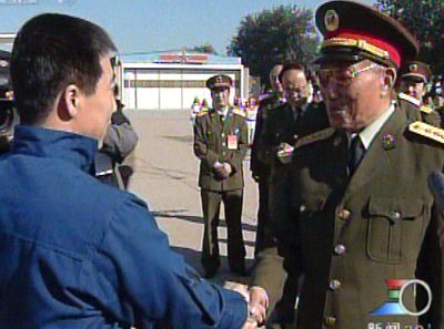 中新社北京十月十六日電 十六日上午,剛剛隨“神舟”五號飛船安全返回地面的中國首位航天員楊利偉,乘專機從內蒙古著陸場飛抵北京。中共中央政治局委員、中央軍委副主席、國務委員兼國防部長曹剛川在中央軍委委員、總裝備部部長、載人航天工程總指揮李繼耐和總裝備部政委遲萬春的陪同下到機場迎接。