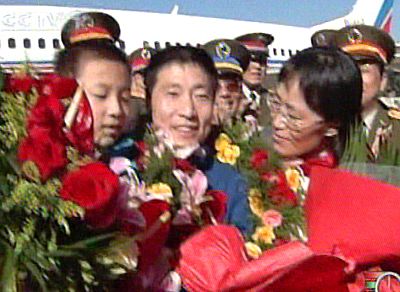 鮮花、掌聲和歡快的迎賓曲迎接這位中國航天英雄的到來。九時五十二分,航天員專機抵達北京西郊機場,勝利完成中國首次載人航天飛行任務的航天員楊利偉健步走下飛機。在機場迎接的曹剛川立即握住了這位英雄的手,并代表中共中央、國務院、中央軍委,向楊利偉表示熱烈的歡迎!曹剛川說,你是中華民族第一位乘坐中國自行設計制造的飛船遨游太空的航天英雄,你的成功飛行,實現了中華民族的千年飛天夢想,向全世界展示了中國人民的偉大創造力和自強不息、勇攀高峰的精神風貌。這既是你個人的光榮,也是國家和人民的榮耀和自豪。
