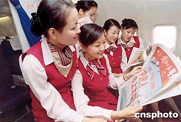 十月十六日,中國首次載人航天飛行取得圓滿成功,上海航空公司的空姐爭看有關報道,分享中國人首次上太空的喜悅。作者:夏本建