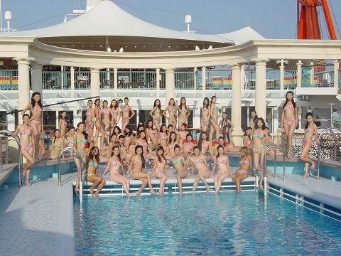 當佳麗們乘坐的麗星郵輪獅子星號從香港行駛到海口時,身著三點式泳裝的50名佳麗宛如出水芙蓉,驚艷“獻身”在郵輪上的露天游泳池旁。面對攝像鏡頭和船上中外游客發出的驚嘆聲,佳麗們自信的展現各種姿態。