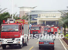 海南十月十七日舉行博鰲亞洲論壇安保演練,迎接十一月初召開的論壇年會。圖為消防車在會議接待酒店博鰲索菲特酒店前進行消防演練。作者:王辛莉