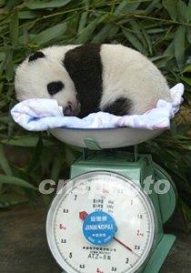 在北京動(dòng)物園出生五十六天的大熊貓幼崽“甜甜”在媽媽“外出”進(jìn)食時(shí),睡夢(mèng)中被飼養(yǎng)員悄悄抱上秤盤(pán),小家伙已經(jīng)從出生時(shí)的150克長(zhǎng)到2,600克。中新社記者:任晨鳴