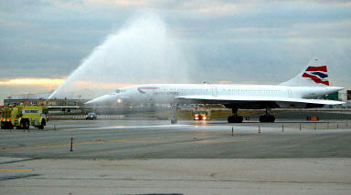 當這架“協和式”以其特有的轟鳴聲降落在肯尼迪機場時,機場的消防車噴出水柱,以示歡迎。飛機的駕駛員從駕駛艙的窗戶伸出一面英國國旗,他還在把飛機開往停機樓的過程中不斷向機場地勤人員招手致意。