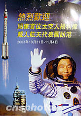 中國首位航天員楊利偉載人航天代表團十月三十一抵香港進行訪問,為歡迎國家首位航天員楊利偉的到來香港貼出醒目海報。中新社記者:錢興強