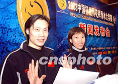 2003年中國杯世界花樣滑冰大獎賽將于十一月初在北京舉行,來自十四個國家的六十四名優秀運動員將參加這一重要國際賽事的角逐。圖為剛剛在美國站比賽中獲得雙人滑冠軍的中國選手龐清、佟健在二十九日舉行的新聞發布會上。中新社記者:武仲林