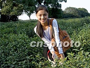 新絲路世界模特大賽的中國佳麗,在十月底金秋時節(jié)的杭州郊外龍井學習採茶。中新社記者:賈國榮
