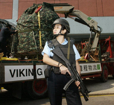 套著“迷彩服”神舟五號返回艙由中國航空公司飛機運抵香港機場,機場保安嚴密,當局派出機場特警保護。
