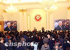 10月31日,身穿深藍色航天員制服的楊利偉在特首董建華陪同下進入禮賓府,特區政府和中聯辦官員、駐港部隊代表及各界知名人士在場歡迎。作者:洪少葵