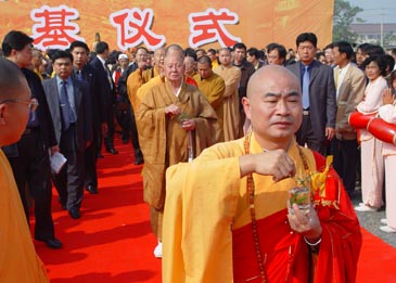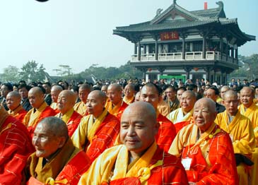 昨天在大明寺棲靈塔下舉行了盛大的紀(jì)念大會。來自國家、江蘇省有關(guān)方面的官員,鑒真東渡經(jīng)過及學(xué)習(xí)過的寺廟之諸山長老法師及港澳臺和日本的客人數(shù)千人參加了大會。紀(jì)念大會由揚州市委副書記、常務(wù)副市長洪錦華主持,中央統(tǒng)戰(zhàn)部副部長朱維群、國家宗教事務(wù)局局長葉小文、中日友好協(xié)會副會長文遲、中國佛教協(xié)會副會長學(xué)誠法師、江蘇省副省長何權(quán)、省委統(tǒng)戰(zhàn)部副部長、省宗教事務(wù)局局長翁振進(jìn)、省臺辦副主任潘朗哉、省對外友協(xié)副會長、省佛教協(xié)會會長明學(xué)法師、日本駐滬總領(lǐng)事杉本信行、日本奈良唐招提寺益田快范長老、臺灣佛光山開山宗長星云、香港大學(xué)副校長、中國工程院院士李焯芬,揚州市府官員孫志軍、季建業(yè)、徐益民等參加了大會。