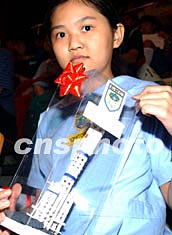 香港中、小學生與楊利偉及航天科學家11月3日在香港伊利莎白體育館舉行見面會,一名小學生向楊利偉送禮品。 中新社記者:錢興強