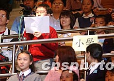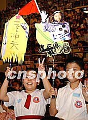 11月3日在香港伊利莎白體育館舉行的香港中、小學生與楊利偉及航天科學家見面會上,學生興高采烈舉著楊利偉像歡呼。中新社記者:錢興強