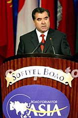 塔吉克斯坦共和國(guó)總統(tǒng)拉赫莫諾夫十一月三日在博鰲亞洲論壇2003年會(huì)上發(fā)表演講。中新社記者:毛建軍