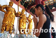 金秋時節在杭州參加新絲路世界模特大賽的中國姑娘,到江南名剎靈隱寺敬拜金剛。這里的古代傳說護法金剛們,素有威武不能屈的美譽,歷來倍受女性們的愛戴。作者:賈國榮