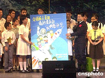 在澳門五日晚舉行的「圓千年飛天夢」綜合晚會上,澳門小朋友向中國首飛航天員楊利偉贈送他們心聲的心意卡。中新社記者:李剛