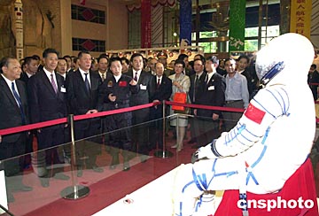 澳門特區(qū)行政長官何厚鏵、全國政協(xié)副主席馬萬祺、中央駐澳聯(lián)絡(luò)辦主任白志健等五日參觀澳門特區(qū)政府舉辦的「中國首次載人航天飛行展」時聽取楊利偉的介紹。中新社記者:李剛